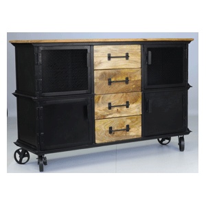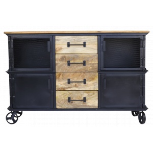 This industrial sideboard on wheels combines aged natural mango wood and black metal for a sturdy and functional design. With 4 spacious drawers, it offers plenty of storage space while being easy to move around thanks to its wheels. The mango wood, with its natural irregularities, adds a unique and authentic charm to this piece. Measuring H97 x W145 x D45 cm, it's the perfect choice for industrial or vintage interiors. Weight: 72 kg.