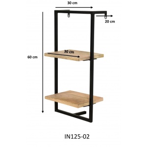 This wall shelf made from mango wood and iron, with two levels, is ideal for an industrial-style interior. Its sleek design and sturdy materials add authenticity to your decor. The natural wood, marked by unique irregularities, gives each piece character. Perfect for storing decorative items or accessories. Dimensions: H60 x W30 x D20 cm. Easy wall mounting.