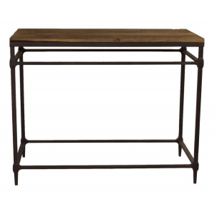 Cette table haute associe du bois de pin vieilli et du métal noir martelé...